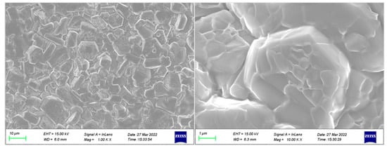SEM images of a La0.75Ba0.25Fe12O19 ceramic specimen, which was sintered at 1400 °C for 3 h and subsequently annealed in an O2 atmosphere at 800 °C for 15 h in 3 steps.