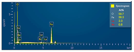 The energy dispersive spectrum (EDS) of La0.75Ba0.25Fe12O19 ceramic specimen.