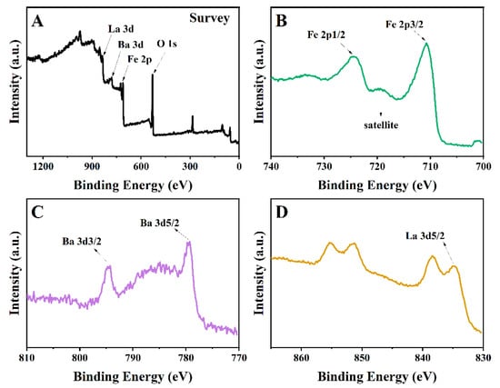 It can be proved by previous studies that La0.75Ba0.25Fe12O19 has been successfully prepared. However, there are still some doubts about the valence state of the Fe atoms in it. For this reason, XPS tests were performed on La0.75Ba0.25Fe12O19. The test results are shown in Figure 4, where Figure 4A is the survey spectrum, from which the presence of each element of La0.75Ba0.25Fe12O19 can be seen. Figure 4B is a fine graph of Fe 2p orbitals. From this figure, the binding energies of electrons in Fe 2p3/2 and 2p3/2 orbitals are 710.67 eV and 723.98 eV, respectively. By comparing these with the binding energies of electrons in 2p3/2 and 2p3/2 orbitals of Fe3+ and Fe2+ in the previous literature, it was concluded that Fe was coexisting in La0.75Ba0.25Fe12O19 as 2+ and 3+ []. However, the binding energy of Fe2p3/2 in La0.75Ba0.25Fe12O19 was closer to that of Fe3+. Moreover, the distance of 2p3/2 from the satellite peak was 8.01 eV, which is closer to the 9 eV of Fe3+, while it is farther from the 6 eV of Fe2+ []. From these two phenomena, it can be concluded that more Fe in La0.75Ba0.25Fe12O19 was present as 3+, where the presence of Fe2+ was due to the substitution of La and insufficient oxygen treatment. The comparison of Figure 4C,D with previous literature on La 3d and Ba 3d can yield evidence for the presence of La and Ba in the tested samples [,].