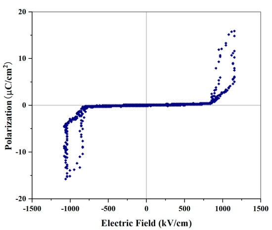 The P–E hysteresis loop was measured on a ferroelectric measurement system based on the Sawyer–Tower circuit. The measurement results are shown in the Figure 5. It can be clearly identified that La0.75Ba0.25Fe12O19 had obvious AFE characteristics in the fully separated double P–E loops. It can be seen from Figure 5 that its critical forward phase field EF was about 1100 kV/cm, and its critical backward phase field EA was about 850 kV/cm. When the external electric field strength was greater than EF, La0.75Ba0.25Fe12O19 would change from the AFE phase to FE phase due to an electric-field-induced phase transition. Then, when the external electric field was less than EA, the FE phase would transform back to the AFE phase, resulting in a double hysteresis loop.