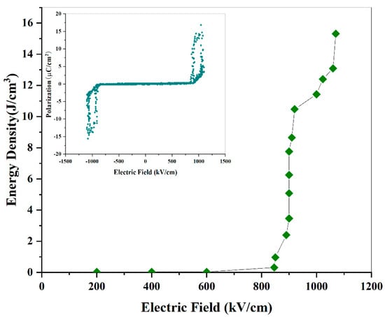 Figure 6 shows the recoverable energy density of La0.75Ba0.25Fe12O19 ceramics under different electric fields. It can be seen from Figure 6 that when the electric field was less than 850 kV/cm, it stored almost no energy, and when the electric field was 850–920 kV/cm, its energy storage density increased dramatically. At field range of 920–1100 kV/cm, the energy storage density still increased but the increasing trend began to weaken. At around 1100 kV/cm, its recoverable energy density was the highest, which was 15.31 J/cm3. This phenomenon can be explained as follows. When the electric field goes into the AFE region, the macroscopic polarization is close to zero, which makes it almost impossible to store energy. However, the electric field induces it to transform from the AFE phase to the FE one at EA, where its macroscopic polarization increases rapidly, and the energy storage density increases accordingly. Finally, when the electric field increases to a certain level, the internal AFE phase has been completely transformed into the FE phase, and the energy storage density reaches the highest value in this region. The inset is the measured double electrical polarization loop for a different sample, which is also the data source for the energy storage density map. Thus, it can be shown that the AFE feature of La0.75Ba0.25Fe12O19 is repeatable and reliable.