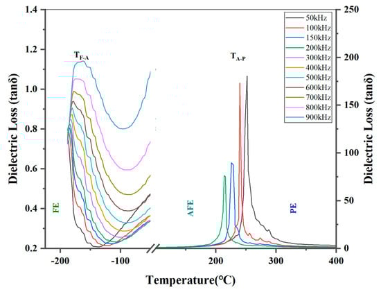 For the dielectric anomaly peaks at low temperatures, it can be clearly seen that the dielectric anomaly peak shifted to the higher temperature side with increasing frequency, showing a dielectric relaxation behavior. These anomalous peaks were corresponding to the phase transition from ferroelectric (FE) to antiferroelectric (AFE). In this FE–AFE phase transition, when the frequency lifted, the switch duration of the electric field was shortened, and the relaxation time corresponding to it should have also been reduced accordingly. Therefore, the temperature region of relaxation polarization appeared, and the temperature of the dielectric loss peak also increased accordingly. Therefore, the dielectric relaxation behavior in the low temperature part was consistent with the FE–AFE phase transition process. On the other hand, the dielectric anomaly peak in the high temperature region was located within the range of 200–250 °C, above which the AFE phase changed to the paraelectric phase (PE).