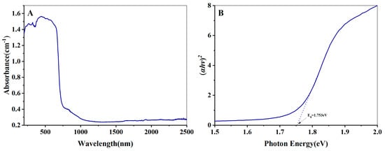 where is the absorption coefficient, is Planck’s constant, is the frequency, A is a constant, and is the semiconductor band gap. When the semiconductor is a direct bandgap semiconductor, = 1/2. After processing the absorption spectrum data according to this formula, the data were plotted with as the y-axis and as the x-axis. By linearly fitting the high-slope straight line segment in the figure and extending the fitted line to intersect the x-axis, the intersection is then determined to be the forbidden band width (band gap energy) of the La0.75Ba0.25Fe12O19 semiconductor. The final calculation result is shown in Figure 8B. In this way, the forbidden band width or the band gap energy of the La0.75Ba0.25Fe12O19 ceramic was experimentally determined to be 1.753 eV.
