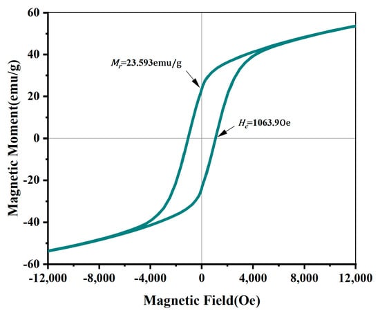 For the magnetic measurement, the La0.75Ba0.25Fe12O19 powder was annealed by oxygen treatment for a total of 15 h in three steps. The magnetization strength M was then measured by a Vibrating Sample Magnetometer (VSM) in relation to the magnetic field strength H. The measurement results are shown in Figure 9, exhibiting a standard M–H hysteresis loop, indicating that La0.75Ba0.25Fe12O19 has a strong ferrimagnetic property. Upon the loop, the saturation magnetization was estimated to be 56.402 emu/g, the remnant magnetization was 23.593 emu/g, while the coercivity force was 1063.9 Oe.