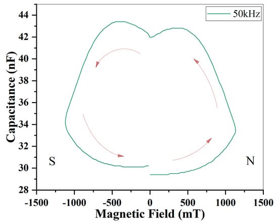 First of all, we measured the electrical polarization behavior of La0.75Ba0.25Fe12O19 ceramics under different magnetic fields. The ceramic pellet was placed in a magnetic field whose direction was perpendicular to its surface, and then the magnetic field strength was continuously increased to 1140 mT in a step of 20 mT. After maintaining the magnetic field strength for about 30 s at each stair, the dielectric parameters were output through the LCR meter to the computer. The capacitance varying with the magnetic fields are shown in Figure 10. It can be seen from this figure that when the magnetic field (H) was increasing in the positive direction, the capacitance was increasing accordingly, and the capacitance reached 33.4 nF when the H field increased to 1140 mT. Afterwards, as the magnetic field reversely reduced down to about 360 mT, the capacitance further increased to 42.8 nF. Then, the capacitance began to decrease when the H field further reversely decreased. After the magnetic field weakened to 0 and then increased in the reverse direction, the capacitance started to increase again, until the magnetic field increased to about −360 mT, and the capacitance increased to 43.4 nF again. After that point, the capacitance began to decrease with the increase in the H field. When the magnetic field increased to −1140 mT, the capacitance decreased to 34 nF, and then as the magnetic field went back to 0 mT, the capacitance further decreased to 30.2 nF. The varying track of the capacitance with the recycling H field looked like a hysteresis loop, which could be designated to be a magnetically induced electric polarization (P–H) hysteresis loop, which is similar to a P–E or M–H loop. The change in capacitance with the H field was caused by the magnetoelectric coupling effect, thus forming a pear-loop-shaped diagram as shown in Figure 10.
