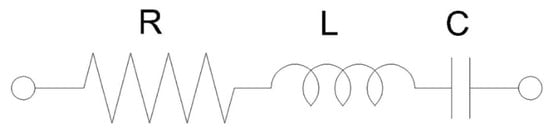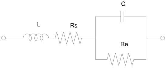 Since the giant magnetoresistance effect was discovered by Baibich et al. in 1988, the GMR effect has been widely used in hard disk drive (HDD) heads []. We measured the complex impedance of La0.75Ba0.25Fe12O19 under different magnetic fields by using a Microtest 6630 LCR meter. We placed the pellet sample coated with silver electrodes on both surface sides in a space between two magnets, whose magnetic field was normal to the surface of the specimen. Then we measured its complex resistance, which changed with the H field under different frequencies. However, if the capacitor was not ideal, it will have parasitic parameters, such as equivalent series inductance ESL and equivalent series resistance ESR, so the capacitor can be simplified as shown in Figure 11. So, the impedance of the actual capacitor can be expressed as: