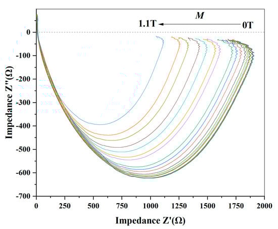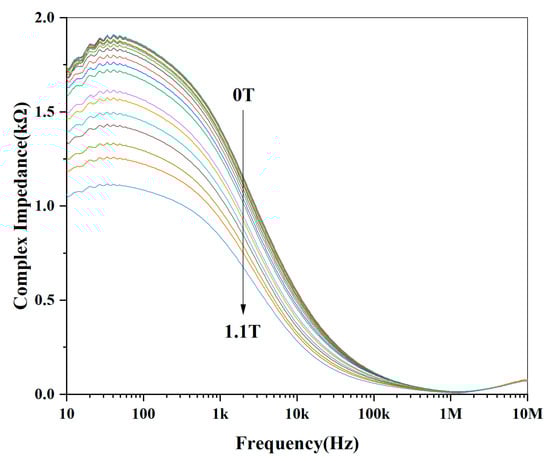 The change in complex impedance with different B fields is shown in Figure 12. It can be seen that the complex impedance largely decreased with the increasing the magnetic field at a low frequency, while in the same magnetic field, the complex impedance sharply decreased with the frequency. At 10 Hz, the complex impedance under the 0 T magnetic field was 1682 Ω. As the magnetic field increased to 1.1 T, the complex impedance was reduced to 1065 Ω. The change rate of Z under M (ΔZ = [Z(B)−Z(0)/Z(B)]%) was − 58%. This MR ratio is similar to the GMR magnitude of Pr0.775Sr0.225MnO3. However, Pr0.775Sr0.225MnO3 shows GMR with this ratio only below −73 °C, while La0.75Ba0.25Fe12O19 demonstrated this GMR ratio at room temperature.
