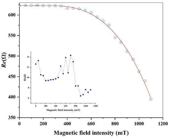 As the magnetic field increases, the complex impedance decreases, causing the real part (Z′) and imaginary part (Z″) of the complex impedance to decrease as the magnetic field increases. However, in the simplified model of the actual capacitor, when the frequency is small, we take the inductor as a path, thus becoming the series connection of the ESR and the ideal capacitor. At this time, the complex impedance can be expressed as . The impedance complex plane composed of the real part and the imaginary part of the complex impedance should be a straight line with an intercept of R and being perpendicular to the real part of the complex impedance, but the actual impedance complex plane is a semicircle, as shown in Figure 13. This is because the capacitor actually has a dielectric loss resistance in parallel with the ideal capacitor C, so the full equivalent circuit of the capacitor is shown in Figure 14. Therefore, the full equivalent circuit can be divided into lead resistances that do not vary with frequency, and a parallel circuit of dielectric loss resistors and ideal capacitor C. The real and imaginary parts of the complex impedance of the parallel circuit of and C can be expressed as a semicircle of expression on the impedance complex plane, but due to the series connection of , the complex impedance of the actual capacitor is a semicircle of in the impedance complex plane. It can be seen in Figure 13 that the radius of the Core–Core circle also decreases with the increase in the magnetic field, that is, the lead resistance is basically unchanged, while the dielectric loss resistance of the capacitor itself decreases with the increase in the magnetic field. This is due to the fact that in the full equivalent model of the actual capacitance in this experiment, the lead resistance varies with the magnetic field strength as shown in the inset in Figure 15. The inset shows that the value of is small and does not show a clear trend with the magnetic field. While the dielectric loss resistance is caused by the sample itself, the value should be closely related to the magnitude of the magnetic field. is the radius of the core circle along the x-axis. In order to get closer to the actual value of , we processed the lowest point of each core circle in Figure 13 and made its variation with the M-field in Figure 15. As the magnetic field increased, changed very little until 600 mT, above which an increase in the magnetic field led to a rapid decrease in . These behaviours are more indicative of a GMR effect for La0.75Ba0.25Fe12O19. As the magnetic field increased to 1.1 T, the real part of the complex impedance decreased from 1901 Ω to 1114 Ω, and the imaginary part of the complex impedance decreased from 623 Ω to 394 Ω. It can be seen in Figure 13 that when the imaginary part was greater than 0, the real and imaginary parts of the complex impedance were no longer part of the Core–Core circle. This is because the parasitic inductance had a more significant effect on the complex impedance at higher frequencies.