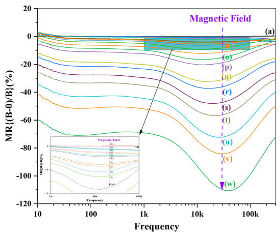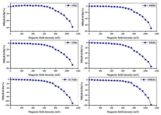 To derive the maximum value of MR, we treated MR as a function of frequency. Since the value of the complex impedance was very small as the frequency was larger than 300 kHz, and the inductive reactance in the capacitor gradually had a greater impact on the complex impedance, we chose to deal with the change in MR with a frequency below 300 kHz, and the result is shown in Figure 16. It can be seen that the MR increased with the enhancement of the magnetic field, and when the frequency was around 36.7 kHz, the MR reached a maximum of −110.6% at a magnetic field of 1.1 T. However, when the frequency was increased to 40 kHz, the MR ratio gradually became smaller. This feature indicates that the response of the complex impedance to frequency was sensitive. In order to find the direct relationship between the complex impedance and magnetic field strength, we made a graph of the MR ratio versus magnetic field strength at different frequencies of 10 Hz, 100 Hz, 1 kHz, 10 kHz, 36.7 kHz, and 100 kHz. The results are shown in Figure 17. It can be seen that when the magnetic field was less than 600 mT, the slope of MR was basically 0. When the magnetic field was gradually larger than 600 mT, the value of the MR ratio started to gradually increase and the enhancement scale became bigger when the M field increased.