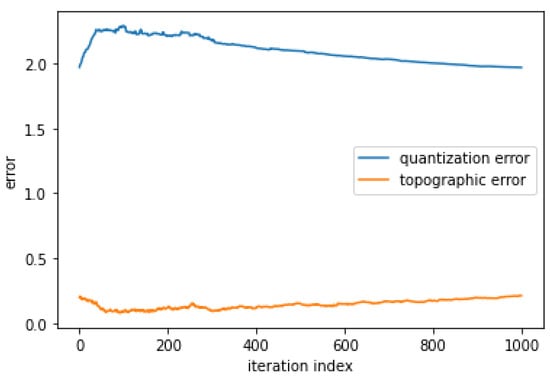 The quantization error is used to measure the distance between the final SOM value and the original input value. It is calculated with the following formula [23,24]:
