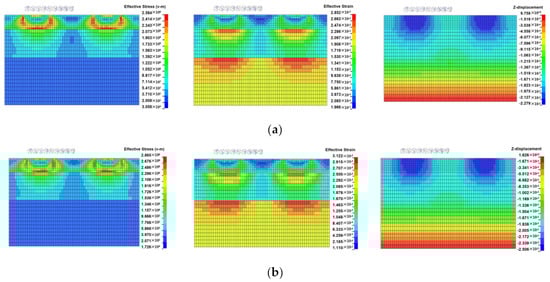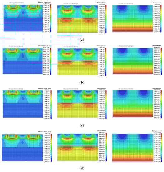 The aircraft landing process is a deceleration process; as the aircraft speed decreases, it is necessary to enlarge the landing pitch angle to increase the lift of the aircraft. Taking a Boeing 737–800 as an example, the upper limit of this aircraft type is theoretically 11°—if the landing pitch angle exceeds this value during landing, the aircraft tail may rub on the ground. With a lower limit of −0.7°, the three landing gears of the aircraft will be grounded at the same time. Therefore, in the general landing process, the aircraft landing pitch angle control is 3°~6°. In this interval, the landing attitude of the aircraft is more stable, which can effectively avoid the landing becoming out of control due to excessive deceleration and reduces the impact on the road surface to ensure the safety of the aircraft landing process. In this paper, under the premise of sinking speed (3 m/s) and tire pressure (2.0 MPa), we investigated the impact on the pavement during the landing process under different landing pitch angles (3°, 4°, 5°, and 6°), and analyzed the change law of the response of effective stress, effective strain, and vertical displacement on the airport pavement with the landing pitch angle, and the related simulation results are shown in Figure 6.