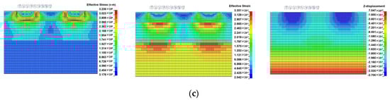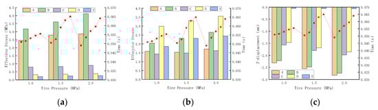 Effect of tire pressure on the impact performance of the airport pavement. (a) Effective stress. (b) Effective strain. (c) Z-displacement.