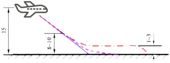 Aircraft landing is divided into the following stages: descent, leveling, level flight deceleration, floating touchdown, and skid. As shown in Figure 7, the flight trajectory is straight down to the ground (blue solid line), floating down to the ground (purple dotted line), and level flight floating to the ground (red dashed line). When an aircraft lands, the buffer system in the landing gear absorbs most of the kinetic energy of the impact, reducing the impact on the aircraft and improving occupant comfort. This process, which typically lasts a short time, is known as the aircraft landing impact.