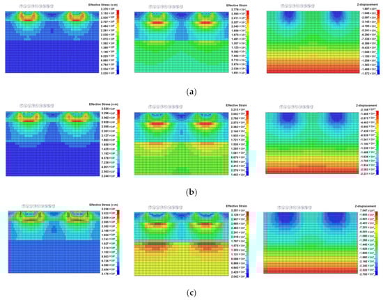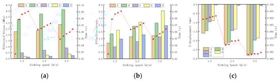 Effect of sinking rate on the impact performance of airport pavement. (a) Effective stress. (b) Effective strain. (c) Z-displacement.