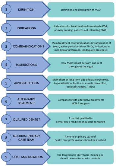 As for the content analysis, videos uploaded by healthcare professionals and hospitals/universities were considered “useful” according to the scoring scheme adopted in the present study, while commercial and laypeople videos showed “moderately useful” scores. In general, these values, failing to exceed the cut-off of 3.00, detected a low level of educational content. In detail, it is noteworthy that no video mentioned all the topics of the customized checklist adopted in the present study. In accordance with the current evidence from the available literature, many videos answered only one or two of the analyzed criteria [16,21]. The most quoted topics in the videos were the definition and indication of MAD, which was clearly the underlying and implied information to start a video dealing with that topic. Less than half of the videos mentioned an alternative treatment like CPAP or surgery, and no information was provided in order to make the viewer educated on the pros and cons of them. The instructions on the usage of MAD were provided in 20% of videos, consisting of wearing the appliance during the night. Only 17% of the videos mentioned short- or long-term side effects like hypersalivation, xerostomia, tooth discomfort, muscular pain or temporomandibular disorders (TMDs) and occlusal changes [41,42,43,44]. As for short-term effects, they are temporary and are going to vanish in days or months. Long-term adverse effects must be clearly explained to patients in order to secure their compliance during treatment. The duration of treatment with MAD is likely to be life-long, and in our study, this aspect proved to be stressed only in 9.5% of videos. We think such a lack of information can be really misleading for patients, who often expect fast and decisive therapy. Another topic that was mentioned only in 9.5% of the videos regards contraindications that should be considered by dentists when proposing MAD for the treatment of OSA. An insufficient number of teeth or general precarious oral health (inadequate prosthetics or restorations, periodontal disease), the presence of active TMDs and a reduction in mandibular protrusion ability are conditions that can impede the usage of MAD [44,45]. The need for a multidisciplinary care team including an otolaryngologist, cardiologist, pneumologist, neurologist and a qualified dentist was mentioned only in 9.5% of videos, and specifically, the figure of a dentist qualified in dental sleep medicine was reported only in 8% of videos. Indeed, the qualified dentist is not only the specialist who confirms the feasibility and manages over time the treatment with MAD in cooperation with the sleep medicine physician but is also a diagnostic sentinel for OSA. In fact, daily, the qualified dentist can encounter many patients and, by collecting anamnesis and performing the oral examination, can pay attention to the signs and symptoms predictive of OSA and then refer the patient to specialists for further examination [45].