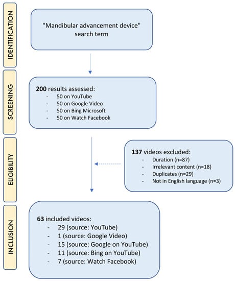 This study is a cross-sectional evaluation of online audio-visual information. On 30 November 2022 YouTube, Google Video, Microsoft Bing and Watch Facebook were searched using the keyword “mandibular advancement device”. Each browser, with its cache cleared, was searched for the first 50 videos sorted “by relevance” in accordance with previous studies referencing that more than 90% of YouTube users scan only the first 3 pages of search results [20]. All 200 videos were screened and categorized simultaneously by two researchers experienced in dental sleep medicine (E.B. and A.F.). Any discrepancies were discussed with a third researcher (S.I.P.) until a consensus was reached. The following exclusion criteria were applied: (1) language not in English, (2) video content not related to the topic, (3) poor audio-visual quality, (4) duplicates, (5) duration shorter than 2 min, assuming a video shorter than that cannot provide any useful information, and (6) longer than 15 min, assuming users might not have the time or patience to watch a video for more than that length of time, in agreement with previous studies [17,21,22].