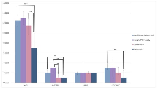 Scores by sources of upload. Data are shown as medians. Video information and quality index (VIQI): *** Healthcare professionals vs. Laypeople, p < 0.0001; ** Commercial vs. Laypeople, p = 0.009. Modified-DISCERN (M-DISCERN): ** Healthcare professionals vs. Laypeople, p = 0.003; ** Hospital/University vs. Commercial, p = 0.005; ** Hospital/University vs. Laypeople, p = 0.002. Content: ** Healthcare professionals vs. Laypeople, p = 0.003.