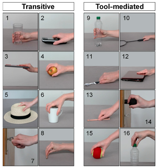 Reaching phase endpoints of performed ADLs. Transitive: (1) drink from a glass [reaching phase endpoint: grasp a glass], (2) receive a call [grasp a telephone], (3) use a book [grasp a book], (4) eat an apple [grasp an apple], (5) put on a hat [grasp a hat], (6) drink from a mug [grasp a mug], (7) remove a key from a lock [grasp a key], and (8) transfer a pencil [grasp a pencil with tripod grip]. Tool-mediated: (9) pour a glass of water [grasp a bottle], (10) make a serve [grasp a racket], (11) brush teeth [grasp a toothbrush], (12) use a laptop [grasp the screen of a laptop for unfolding], (13) draw a line [grasp a pencil with a lateral pinch grip], (14) open a door [grasp a door knob], (15) transfer a tennis ball [grasp a tennis ball], and (16) unscrew a bottle (grasp a bottle top).