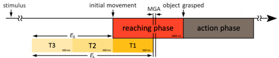 The EEG signal had 31 channels and was processed separately for each subject using the Toolbox EEGLAB [33] for MATLAB (Vers. R2020a, The MathWorks Inc., Natick, MA, USA). The raw data were notch- (50 Hz) and bandpass-filtered using the finite impulse response filter. To investigate possible influences of frequency bands on the classification results, the bandpass filtering was performed using the combined alpha and beta sub-bands of the waking state (fα-β = 8–30 Hz), as well as using the whole EEG signal spectrum covering sub-bands from delta up to gamma (fδ-γ = 0.5–100 Hz). To separate actual brain signals from interference signals resulting from muscle and eye artifacts and superimposed brain signals, a linear decomposition was performed using independent component analysis [33]. Confining events, such as “initial movement” and “object grasped”, were identified manually with the aid of synchronized videos, according to the protocol of Sivakumar et al. [18], which allowed us to separate the reaching phase from the action phase (Figure 2). In all ADLs, the reaching phase had a duration of at least 800 ms, which resulted in the earliest occurring MGA interval of 488–520 ms [18]. For the discrimination, two data epochings of different durations were chosen within the limits of when neuronal representations should already be reliably detectable [23], but at which point the hand is not yet preparing for the respective grasping posture, i.e., fulfilling a pre-shaping for the grasping object. Hence, discrimination must be accomplished before the MGA is reached; the duration T1 was thus defined as 500 ms after the initial movement, which is in line with grasping phase latencies [34]. A long epoch EL resulted from the total sum of two equal lasting time windows, T2 and T3, prior to the initial movement (EL = T1 + T2 + T3 = 1500 ms [−1000 ms ≤ EL ≤ 500 ms]). To determine whether an earlier discrimination might allow a prosthetic device more time for hand preparation execution for grasping tasks, a short epoch ES was defined prior to the initial movement (ES = T2 + T3 = 1000 ms [−1000 ms ≤ ES ≤ 0 ms]).