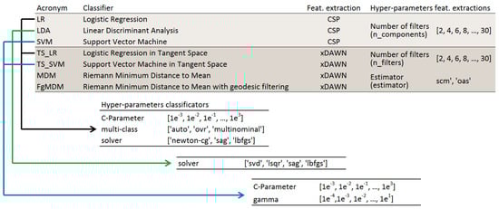 Combined classifiers with feature extraction methods (gray) and the applied hyper-parameter optimizations (white). Settings of the optimization algorithms were selected based on the multinomial option from the Python library (not necessary for the Riemannian geometry).