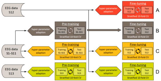 Scenarios (A–D) exemplified using S12 as the target subject for the fine-tuning of classifiers. The same procedure was applied when using S13 as the target subject by an exchange of S12 data and S13 data in all scenarios, and vice versa.