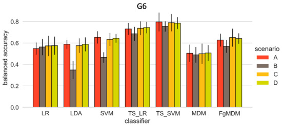 Balanced discrimination accuracies (mean ± sd over all grasps) as a function of the grasping posture categorization G6 of the applied classifiers linear regression (LR), linear discriminant analysis (LDA), support vector machine (SVM), LR in tangent space (TS_LR), SVM in tangent space (TS_SVM), Riemann minimum distance to mean (MDM), MDM extended by geodesic filtering (FgMDM), and scenarios A–D from Figure 4 using bandpass-filtered (fδ-γ = 0.5–100 Hz) and epoched (−1000 ms ≤ EL ≤ 500 ms) EEG signals.