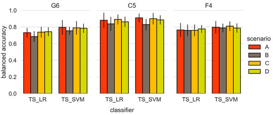 On inspecting the remaining classifiers to compare the grasping posture categorizations, the significantly highest accuracies were achieved using the C5 categorization according to the Cutkosky taxonomy (p < 0.008) [30]. On excluding scenario B again, these average accuracies were BA = 0.88 ± 0.07 for the TS_LR algorithm, and BA = 0.90 ± 0.06 for the TS_SVM algorithm for the combined delta and gamma frequency band and the long epoch (Figure 6). In this case, a trend towards maximum accuracy values was found for the TS_LR algorithm with BA = 0.90 ± 0.06 in scenario C, and with BA = 0.91 ± 0.05 for the TS_SVM algorithm in scenario A. Across all scenarios, lower accuracies were observed in the G6 categorization with the TS_LR algorithm with mean BA = 0.73 ± 0.06, and for the TS_SVM algorithm with mean BA = 0.78 ± 0.07 (averaged over all scenarios). On excluding scenario D (fine-tuning with pre-training using S12/S13 data and hyper-parameter adjustments for the target subject), a comparably high accuracy result for S12 and the TS_SVM algorithm was found for the F4 categorization. Due to the general dominance of the C5 categorization, the G6 and the F4 categorization results are omitted in the following. However, it is important to note that a different number of grasps fall into the categorizations and a direct comparison between categorizations has to be considered with caution.