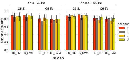 There were no significant differences in the accuracies on comparing both frequency bands (p > 0.07, see Figure 7). When comparing the epochs, TS_SVM performed significantly better for the long epoch (EL) for scenarios A and C in both frequency bands (p < 0.032) and for scenario D in the extended frequency band f = 0.5–100 Hz (p = 0.039). TS_LR also performed significantly better for the longer epoch for scenario C in the extended frequency band (p = 0.004). Other significant differences were not observed. Overall, there was a general tendency towards higher accuracy for the long epoch, irrespective of the frequency band. The highest and most constant accuracy that already became evident during the grasping posture categorization was with the TS_SVM algorithm, with a BA = 0.91 ± 0.05 for scenario A (fine-tuning without pre-training) with the combined delta and gamma frequency band and the long epoch; this value did not differ from those of scenarios C or D.