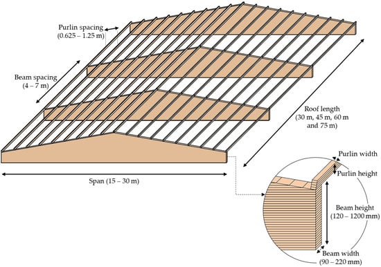 Since large open spaces and long spans are often required, regular double-tapered beams are frequently employed in agro-forestry constructions. In addition, their use also entails a lower construction time, as their characteristic shape, without intermediate joints, enables them to be executed as a single construction element. Therefore, a roof timber structure composed of regular double-tapered beams and purlins is proposed as an alternative to be optimized in this research (Figure 1). The material of both the beams and purlins is glulam GL32h, whose characteristic strength and stiffness are established in the EN 14080 standard []. Moreover, a 3D approach is followed; thus, the optimization is not limited to the cross-sections of the structural elements but extends to their arrangement in the structure (i.e., the separation between beams as well as the separation between purlins are also subjected to optimization).