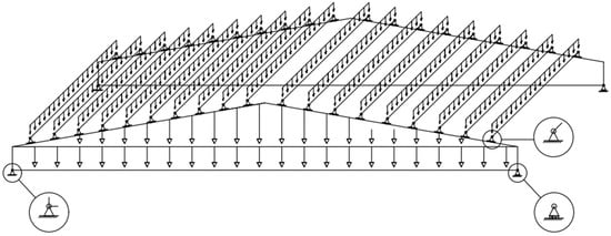 A numerical calculation program parameterized in MATLAB R2022a (Natick, MA, USA) was developed to calculate roof structures consisting of glulam beams and purlins. Figure 2 shows the structural design model for the optimization of the roof structure studied in this investigation. As illustrated, the gable roof comprises regular double-tapered beams and bi-supported purlins without bracing against lateral buckling.