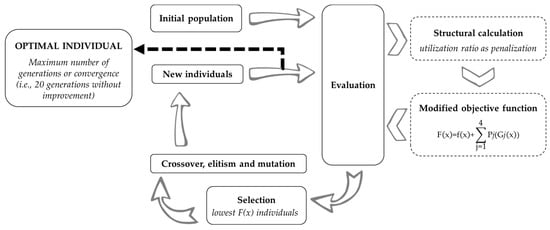 As previous studies [,,,] have described structural optimization using genetic algorithms, this section focuses solely on its adaptation to the present research work.