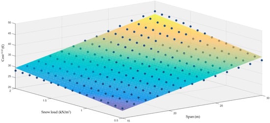 - Using the proposed statistical model for a known snow load and span, reliable predictions arise for the optimal values of cost, beam height, beam base, purlin height, purlin base, beam spacing and purlin spacing. After analyzing the combinations of variables, it can be seen that wind has no significant effect on the overall cost; therefore, neither does the height of the building, which was evaluated between 5 and 7 m.