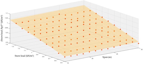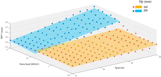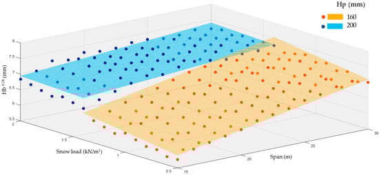 To determine the optimal value of Wb based on the Snow, Span and Hp values, multiple regression planes were constructed using Equation (23).