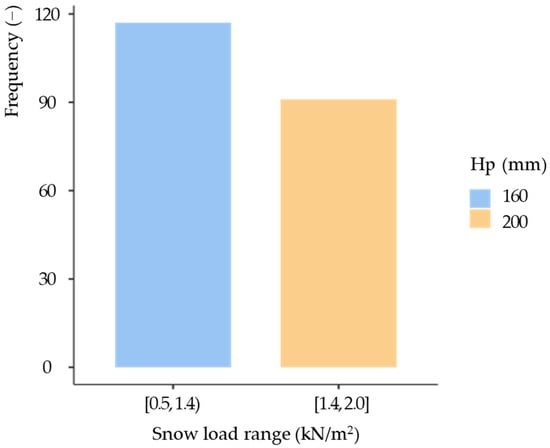 Table 7 and Figure 7 present the number of data points for each value of purlin height as a function of two snow load ranges. When the snow load falls between 0.5 and 1.4 kN/m2, the optimal purlin height is 160 mm. Conversely, when the snow load is between 1.4 and 2.0 kN/m2, the optimal purlin height is 200 mm. These findings align with those of Villar-García et al. [], as it is observed that the purlin height is based on a minimum height of 160 mm, which is equivalent to four timber sheets of 40 mm.