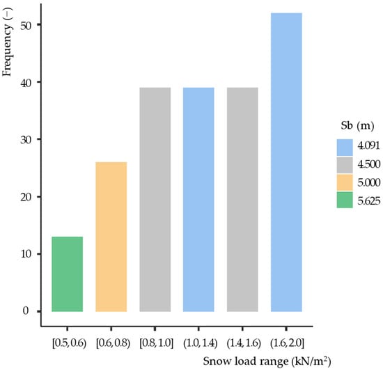 For an analysis at a fixed roof length of 45 m, Table 10 shows the data count for each value of beam spacing as a function of snow load intervals, which is also illustrated in Figure 9.