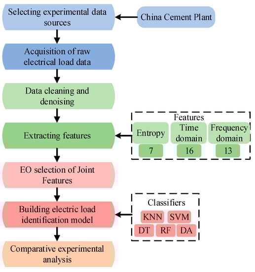 Figure 1 illustrates the exact experimental procedure of this paper. The experiment selects the load data of a Chinese cement plant, which includes the active and reactive power of nine pieces of equipment. First, the electric power data are cleaned according to the original power signal data sampling. Subsequently, entropy value features are introduced based on extracted time-frequency domain characteristics to enhance the quality of the joint feature set. Finally, the EO screens the feature categories of the electric loads and uses the selected feature subsets as model inputs for equipment classification. To verify the feasibility of introducing entropy value features and EO feature selection in industrial electric load identification, the authors also conduct comparative experiments to demonstrate the necessity and superiority of the experimental steps.
