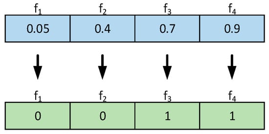 In this function, represents a random variable. If exceeds this random variable, the continuous value is converted to “1”, signifying that the corresponding feature is chosen during classification. If is smaller than this value, the continuous value is changed to “0”, indicating that the corresponding feature is excluded.