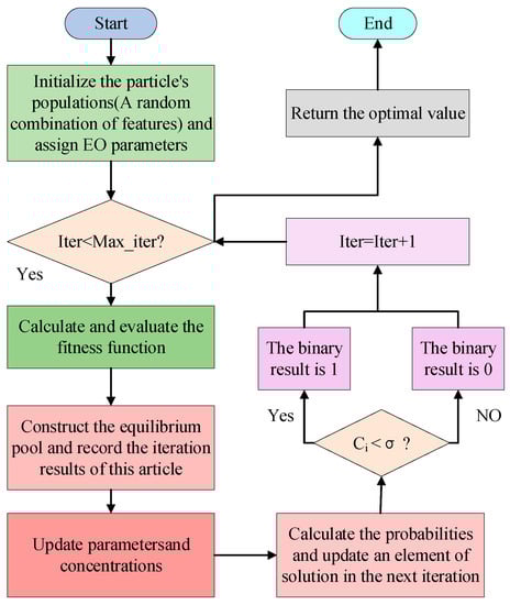 Feature selection constructs a low-dimensional features subset, but retains the complete information expressed by the overall features. The advantages are improved experimental accuracy, reduced feature dimensionality, and reduced model time cost. As a metaheuristic algorithm, the EO is used in feature selection as a wrapper-based optimization search strategy. However, feature selection is an optimization issue that involves discrete values of 0 or 1 for particle concentration. Therefore, a binarization operation is required.