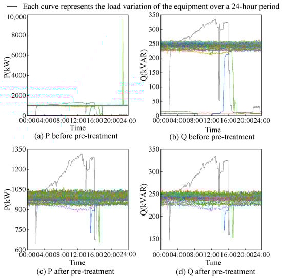 In this paper, nine standard pieces of industrial equipment from a Chinese cement plant were selected as experimental subjects, and the original dataset included three months of electrical measurement parameters of the equipment. Due to the low sampling frequency of industrial power scenarios, the quality of raw power data is poor. Therefore, the authors improved the data quality by pre-processing data cleaning and denoising to reflect the actual identification results. To visualize the data processing, the authors selected reactive and active power of KHT to reflect alterations in the power curve, as shown in Figure 4. Each curve in Figure 4 shows the load changes for 24 h of the day. Among them, (a) shows the active power curve for 90 days before KHT pre-processing, and (b) shows the reactive power curve for 90 days before KHT pre-processing. (c) shows the active power curve for 72 days after KHT pretreatment, and (d) shows the reactive power curve for 72 days after KHT pretreatment.