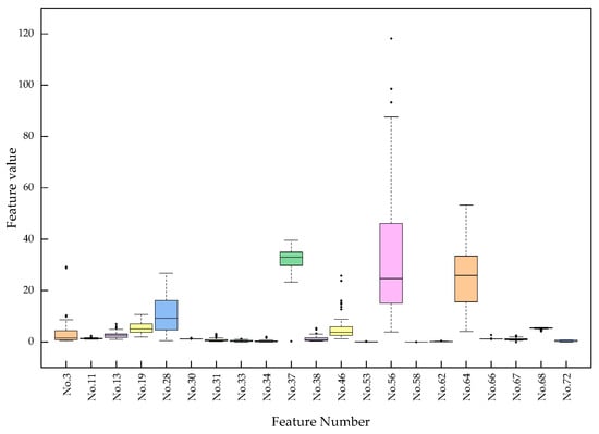 Because the distribution of features reflects the inherent structure and patterns of the data, the visualization of feature distribution is an essential component of the feature selection and classification process. In Figure 5, box and whisker plots can identify anomalies among the 21 selected features, provide the data distribution for each feature, and allow for their comparison. The mean of the texture is represented by the horizontal line in the frame at the bottom. The first horizontal line represents the first quartile of the average texture. The second horizontal line indicates the texture median. The horizontal line at the top of the graph represents the utmost value of the texture’s mean, and the tiny diamonds are outliers. Due to their feature types and data quality, the distribution of the screened features has some variability. There are a few anomalies, among which the feature extraction values of the entropy-valued features are generally lower and more densely distributed.