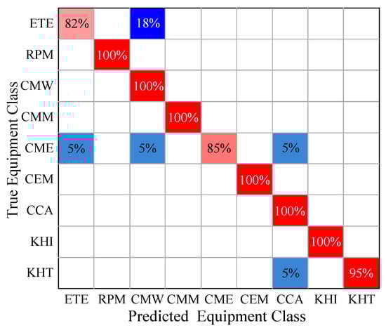 To demonstrate the practical effectiveness of the method proposed in this paper for identifying electrical loads in industrial settings, visualizations were created. In Figure 6, the confusion matrix demonstrates the classification details of the electrical loads for SVM. From Figure 6, the identification of each industrial piece of equipment can be clearly understood. The blue color indicates incorrect classification and the red color indicates correct classification. Among them, 82% of the equipment type ETE was correctly identified and 18% was incorrectly identified as CMW. Additionally, 85% of the equipment type CME was correctly identified, while 5% was incorrectly identified as ETE, 5% was incorrectly identified as CMW, and 5% was incorrectly identified as CCA. Further, 95% of the equipment type KHT was correctly identified and 5% was incorrectly identified as CCA. All of the rest of the equipment was correctly identified. Therefore, the features screened by EO from the joint features can help the model analyze the industrial equipment types accurately.
