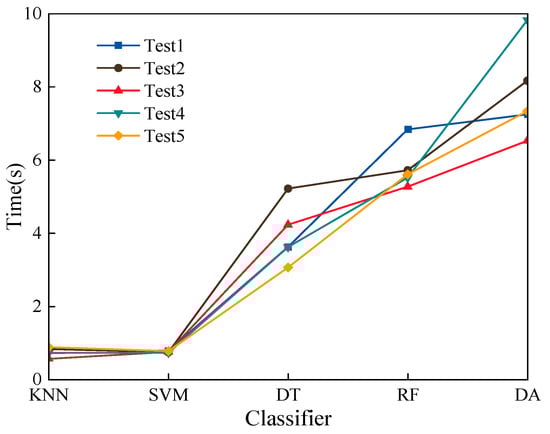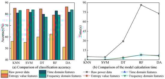 Firstly, observe the comparison of the accuracy before and after feature extraction. The raw power data were poor on different classifiers, where the classifier with the highest accuracy was RF with 62.5%. The classifier with the worst classification accuracy was DA, which was only 51.12%. For industrial power scenarios, raw power data cannot meet the usage requirements in terms of accuracy. The three load features extracted from the raw power data improved the effect on the classifier significantly. Among them, entropy features exhibited a higher classification accuracy in comparison to time domain and frequency domain features. Taking SVM as an example, the classification accuracy of the entropy value feature reached 84.17%, which was 52.18% better than that of the raw power data. Subsequently, focus on the change in model computation time before and after feature extraction. The difference in raw power data was more evident in different classification models. Among them, SVM had the shortest computation time of 4.2412 s. In contrast, RF had the longest computation time, which reached 86.3788 s. The main reason for such an extended model computation time for raw power data was the high dimensionality of the data and the complexity of the model computation. After extracting the features, the time cost of the model was greatly reduced. Among them, the computation time for the three independent feature sets was relatively similar. Taking SVM as an example, the computation time for the entropy value feature model was only 0.1353 s, which was 3.19% that of the initial power dataset. Moreover, computation time for time domain features and frequency domain features also declined, to 0.1697 s and 0.1644 s, respectively. Due to the variability of classifiers, the time reduction for RF was the most obvious, and the computation time for entropy value features was reduced by 78.5805 s after feature extraction. With feature extraction, the model input dimensionality of industrial equipment was reduced from 288 to 14 dimensions (entropy value features). The remarkable decrease in dimensionality truly minimized the model computation time and simultaneously enhanced recognition accuracy. Thus, feature extraction not only preserves the information relevance of the industrial equipment, but also greatly reduces the redundancy of the data.