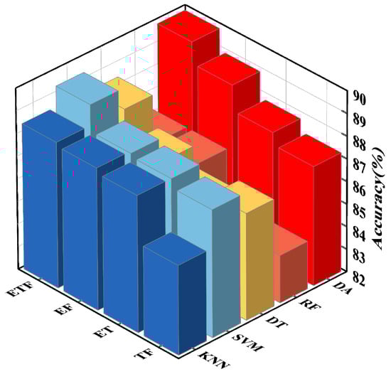 A wealth of feature extraction space is essential for model performance improvement. To expand the feature space, numerous features were obtained from the raw data, and an attempt was made to combine them. To compare the pros and cons of different feature combinations in identifying electricity consumption in industrial power scenarios, the authors developed identification models using different classifiers and used the recognition accuracy of the corresponding classifiers as the judging criteria. The feature combinations were used as model inputs. Their accuracy comparisons on different classifiers are presented in bar charts, as in Figure 9. The combinations of two features included time domain features with frequency domain features (abbreviated as TF), entropy value features with time domain features (ET), and entropy value features with frequency domain features (EF). There was also a joint feature set (ETF) that aggregated all features.