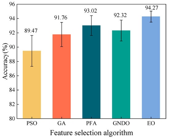 First, observe the algorithm’s accuracy. Using a bar chart to depict the average accuracy and an error bar to indicate standard deviation, Figure 10 visually illustrates the comparison of the precision from different feature selection algorithms. As indicated in Figure 10, the accuracy of the features screened by the EO was higher than that of the remaining four algorithms, with an average accuracy of 94.27%. The accuracy of the other four algorithms ranged from 89.47% to 93.02%. The authors also noted that the EO had the best stability in screening features, with the lowest standard deviation of 0.7718%. Thus, the EO has an advantage over the classical (PSO, GA) methods in terms of accuracy and also over the algorithms newly proposed in recent years (PFA, GNDO).