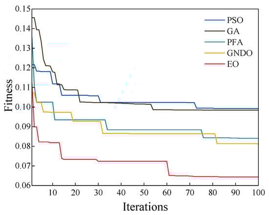 After comparing the accuracy, the focus was on the feature dimension of the screening. The convergence curve of the feature selection process was observed through 100 iterations. During the iterations, the error rate was adopted as the fitness function. The iterations are shown in Figure 11. The EO reduced the error rate from 0.11203 to 0.06431 after 83 iterations. The EO had the best adaptation compared to PSO, GA, PFA, and GNDO, indicating that it has better feature selection ability for industrial power loads. After completing the iterations, the feature selection dimensions of the different algorithms were recorded. Among them, the EO had 21 dimensions, the PSO had 35 dimensions, the GA had 32 dimensions, the PFA had 34 dimensions, and the GNDO had 29 dimensions. The EO had a minor feature dimension, and a smaller feature dimension will also make the feature subset more efficient in terms of time cost.