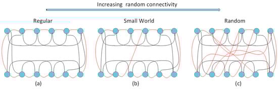 Small-world network realization for different probabilities without changing the number of nodes and edges; (a) p = 0, original graph and all edges are unchanged; (b) p is a number between [0, 1]; (c) p = 1, random network with all edges rewired [6].