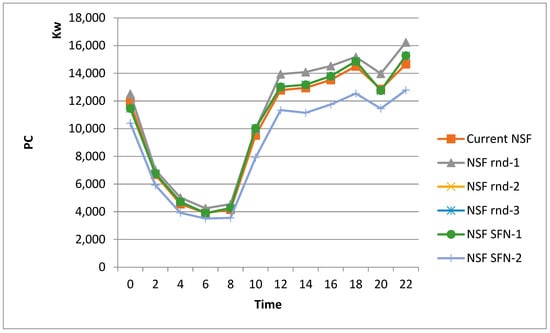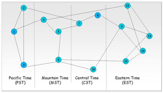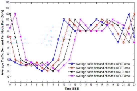 The base evaluated network model is the NSF network, as illustrated in Figure 2, and consists of 14 nodes located in different states of the United States (US) with 21 bi-directional links and with an average shortest path of 2.175. As depicted in Figure 2, the nodes of the NSF are in four time zones: Eastern Standard Time (EST), Central Standard Time (CST), Mountain Standard Time (MST), and Pacific Standard Time (PST). There is a one hour difference between every two adjacent time zones. During the day and night, different nodes experience different traffic loads. Figure 9 illustrates the traffic load in Gb/s between all node pairs for a period of 24 h. The traffic is generated using a gravity model based on the population of the city where the node is located [14]. The average traffic load between node pairs varies between 20 to 120 Gb/s, and the peak occurs at 22:00.