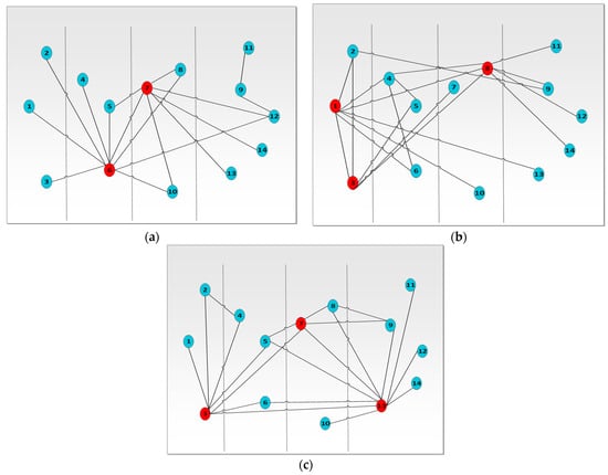 Samples of SFN graph’s implementation on the NSF’s 14 nodes with 21 edges; (a) SFN sample 1, (b) SFN network sample 2, (c) SFN network sample 3. (Note: nodes in red are heavily connected hob nodes).