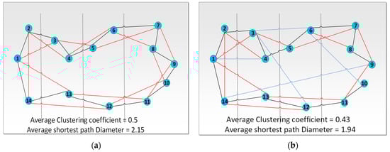 The clustering coefficient and path length properties are highly affected by edge rewiring, which is governed by the predefined (p). For p = 0, the network is unchanged. However, as the probability increases to approach 1, all edges are rewired, and the clustering coefficient and average path length become the lowest that can be attained. Modifying the probability of edge rewiring for values between 0 and 1 (e.g., p = 0.1), a small-world network will be generated with a high clustering coefficient, as with a regular graph, and a low diameter, as with a random graph.