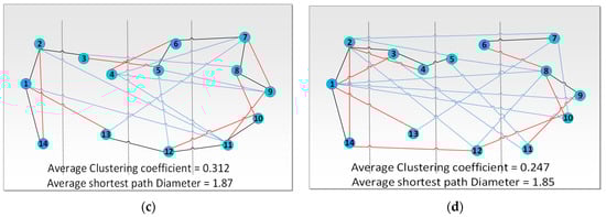 To create small-world and random graphs to interconnect the 14 nodes of the current NSF network, the methods described by Watts and Strogatz in [11,12] are implemented. Figure 4 and Figure 5 illustrate samples of generated small-world and random graphs that mimic the NSF’s 14-node connectivity model.